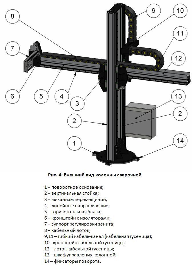 Металлоконструкции колонны изготовлены из конструкционного алюминиевого профиля в сборе с линейными направляющими и зубчатой рейкой. Линейные направляющие обеспечивают надёжность работы конструкции при линейных перемещениях. На торце горизонтальной балки установлен суппорт корректировки положения зенита, на который устанавливается сварочная головка. В центре колонны располагается двигающийся по вертикали механизм перемещений (сварная конструкция). Вся конструкция колонны закреплена на поворотном основании, позволяющем правильно ориентировать колонну по отношении к оси изделия, и может вручную поворачиваться около вертикальной оси на 360°.