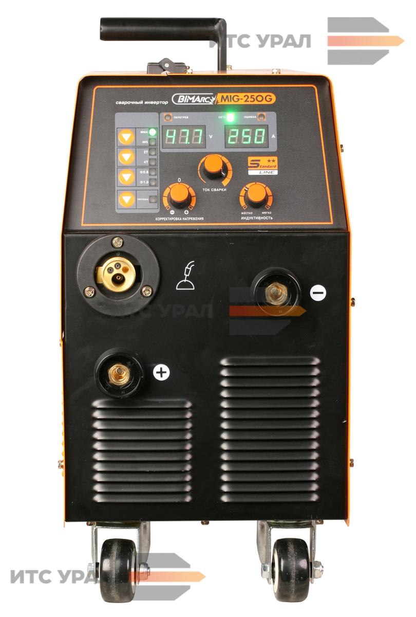 Полуавтомат сварочный MIG-250G BIMArc Standard Line предназначен для дуговой сварки плавящимся электродом на постоянном токе в среде защитных газов изделий из малоуглеродистых сталей (MIG), с естественным охлаждением горелки. Управление полуавтоматом осуществляется с помощью органов управления, расположенных на лицевой панели, и кнопки на горелке. Полуавтомат имеет синергетическое управление сварочным процессом, что существенно упрощает настройку и подбор режимов. В полуавтомате дополнительно предусмотрен режим работы ручной дуговой сварки покрытыми электродами (ММА).